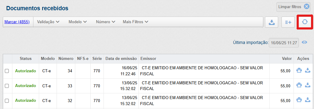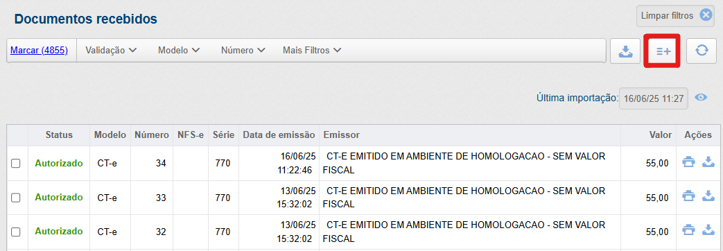 Para as empresas que possuem a extensão em pauta ativa, pode ser realizada a importação manual dos documentos, tanto para a SEFAZ (NF-e, CT-e e CTeOS), quanto para as prefeituras (NFS-e), por meio do ícone evidenciado abaixo: