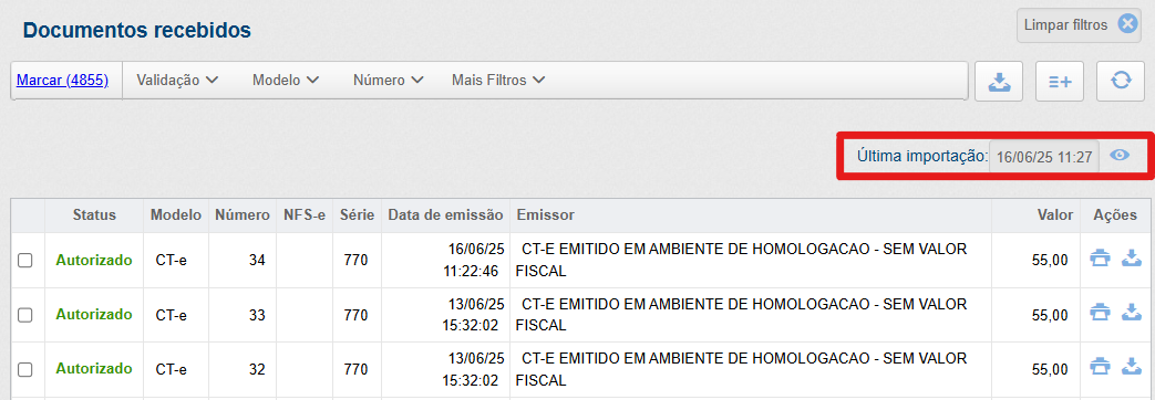 Também é possível acessar as últimas importações de cada empresa à qual você possui acesso, organizadas por módulos fiscais, permitindo obter um detalhamento completo de cada um desses documentos.