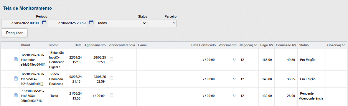 O ícone "Tela de Monitoramento" se refere a tela para o monitoramento do parceiro sobre as vendas dos certificados, apresentando algumas informações básicas sobre a compra do certificado, como: