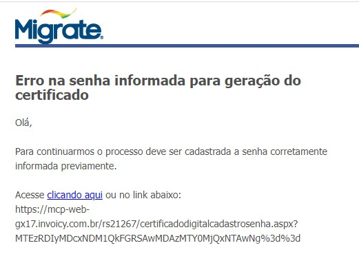 Através da tela de monitoramento, enquanto o certificado estiver pendente de senha será exibido um ícone na primeira coluna, se selecionado ele redireciona a uma tela para realizar a solicitação da senha de forma manual. O certificado será gerado somente se a senha estiver correta, caso informe uma senha que não é válida, será enviado um e-mail notificando e solicitando para que o processo seja refeito, conforme evidenciado aqui;