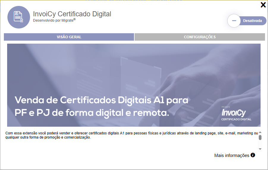 A extensão "InvoiCy Certificado Digital" permite que o parceiro tenha acesso à ativação e às configurações do produto, bem como à gestão completa dos certificados. O parceiro poderá realizar a venda de certificados de forma integrada, utilizando seus próprios canais de comercialização, como ERP, landing pages, site ou e-mail marketing.