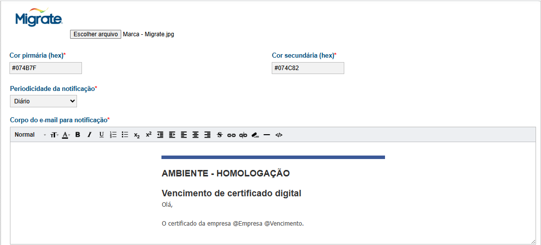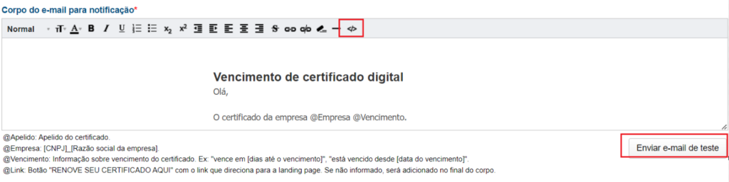 Corpo do E-mail para Notificação: O parceiro pode configurar uma padrão de mensagem para o e-mail de notificação do certificado que será enviado para o cliente que consumir o produto. Além dos textos serem editáveis, existem algumas ações pré determinadas que ele pode utilizar, como por exemplo: