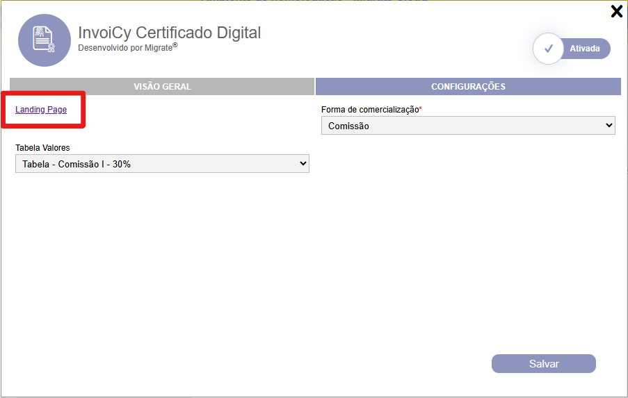 Tabela Valores: Selecione a tabela de acordo com a porcentagem de comissão que deseja receber sobre a venda do certificado. Será possível configurar três opções de tabelas de valores para a comercialização do certificado.