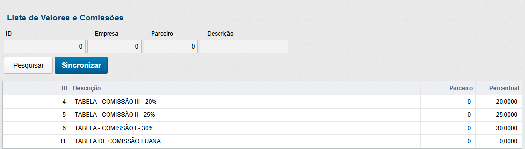 O ícone "Valores e Comissão" apresenta a lista das tabelas de valores e comissões cadastradas pelo parceiro, contendo a descrição da tabela, o código do parceiro e o percentual de comissão referente a cada tabela criada.