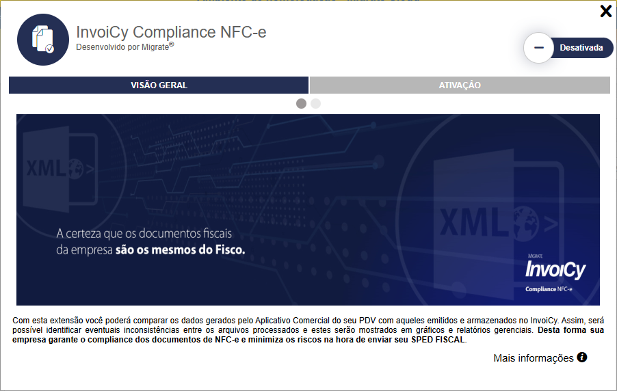 A extensão InvoiCy Compliance permite ao usuário comparar os dados gerados pelo Aplicativo Comercial do seu PDV com aqueles emitidos e armazenados no InvoiCy, possibilitando assim identificar eventuais inconsistências com o fisco. Estas inconsistências existentes serão exibidas em gráficos e relatórios gerenciais. Assim a sua empresa garante o compliance dos documentos de NFC-e e minimiza os riscos na hora de enviar seu Sped Fiscal.