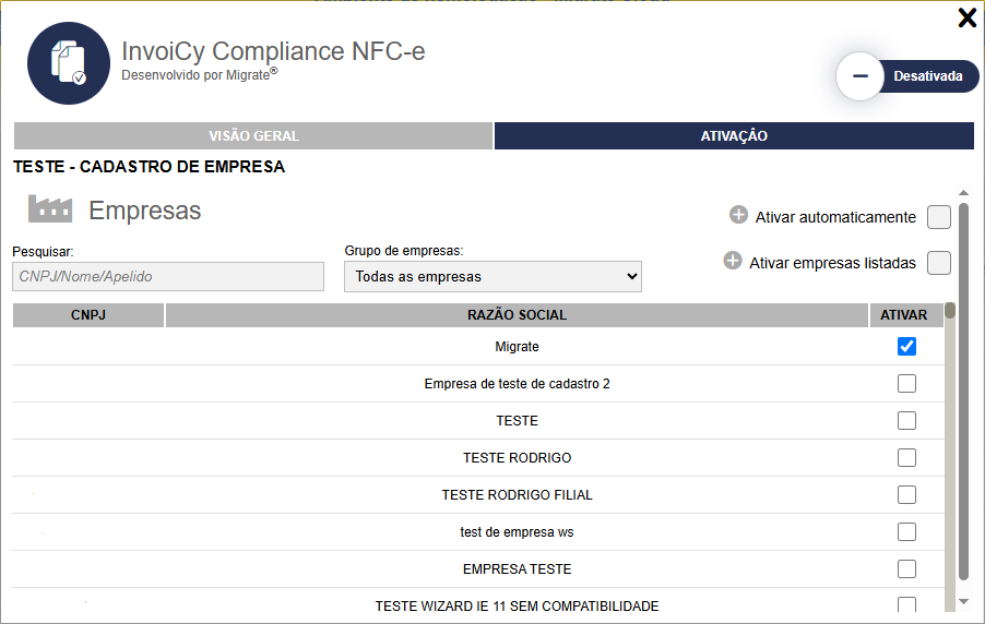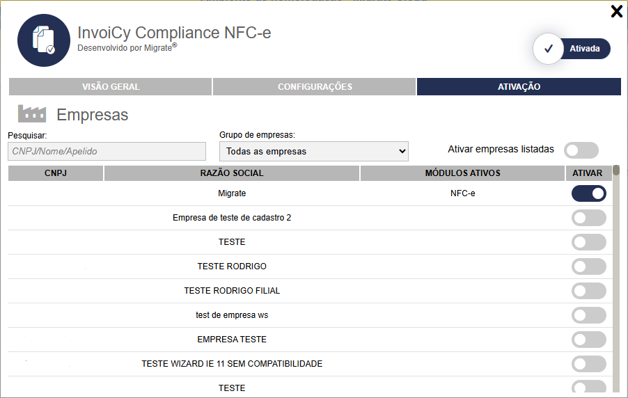 Na aba "Ativação", é possível buscar por determinadas empresas mediante as opções de filtro: CNPJ/Nome/Apelido e Grupo de Empresas.
