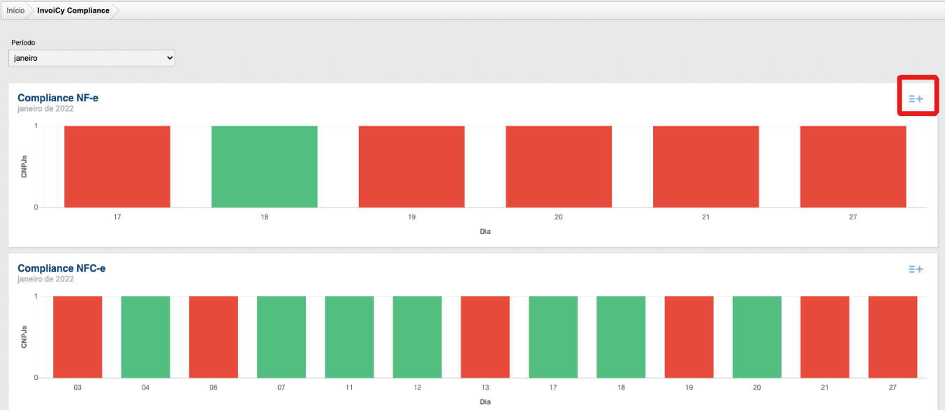 Após fazer a integração e enviar os arquivos para conciliação, na tela "InvoiCy Compliance" serão exibidos os gráficos, de acordo com cada módulo, com o agrupamento de todas as conciliações, apresentando os CNPJs por dia que estão em conformidade ou não, de acordo com o período do mês selecionado, sendo atualizado conforme cada conciliação realizada.
