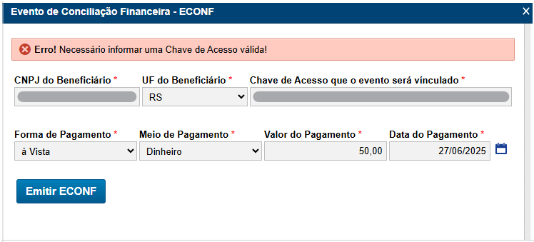 Valor do Pagamento: Informar o valor do pagamento realizado através do ECONF;