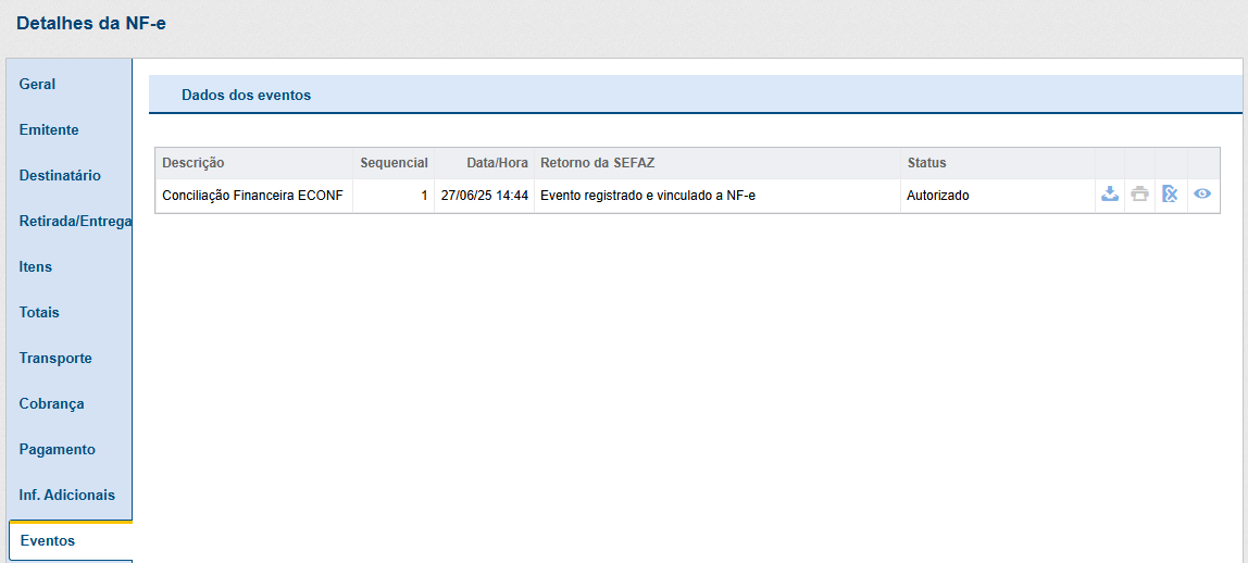 Nos detalhes do documento emitido (NF-e ou NFC-e), clique na aba "Eventos" para localizar o evento ECONF, bem como realizar o download e cancelar este documento.
