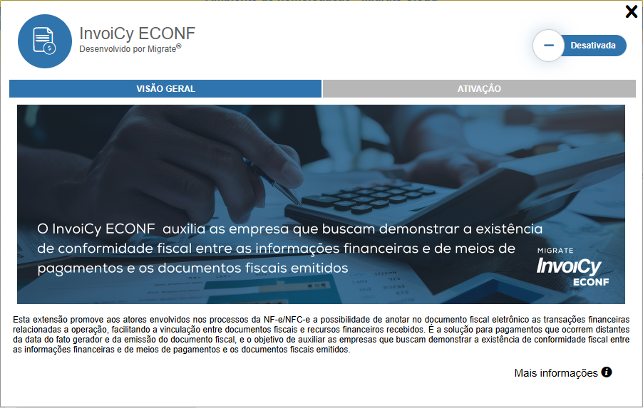 O intuito da extensão InvoiCy ECONF é proporcionar os eventos de conciliação financeira, tendo a possibilidade de anotar no documento fiscal eletrônico (NF-e e NFC-e) as transações relacionadas à operação, facilitando a vinculação entre documentos fiscais e recursos financeiros recebidos.