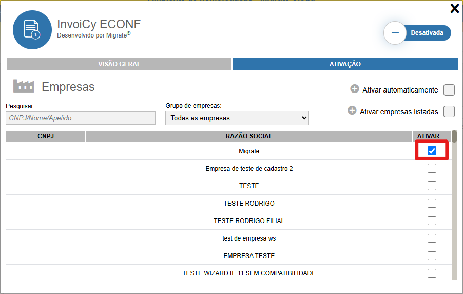 Nessa mesma aba se encontra a opção de ativar a extensão. Para ativá-la, localize a empresa(s) que pretende ativar a extensão, e clique no checkbox da coluna "Ativar".