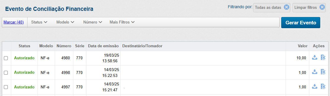 Ao clicar no ícone mencionado, será exibida a tela "Evento de Conciliação Financeira", onde serão listados todos os eventos de conciliação financeira emitidos pela empresa selecionada, possibilitando aplicar diversos filtros de busca e realizar a digitação do evento via tela, se desejar.