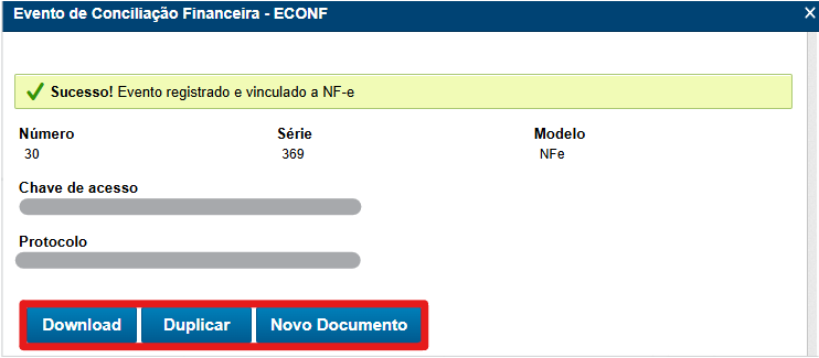 Após inserir os dados do evento, selecione "Emitir ECONF". Com o retorno da autorização, três opções serão exibidas na mesma tela, conforme destacado abaixo: