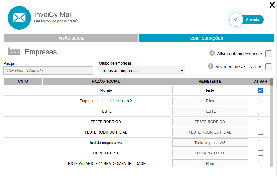 Através da aba de "Ativação", é possível selecionar a(s) empresa(s) em que se deseja ativar ou desativar esse serviço, de acordo com os seus acessos. Também é possível buscar por determinadas empresas mediante as opções de filtro: CNPJ/Nome/Apelido e Grupo de Empresas. Além disso, a funcionalidade oferece a opção "Ativar Empresas Listadas", que permite ativar a extensão para todas as empresas às quais o usuário tem acesso.