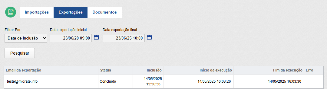 Nesta tela, é possível visualizar os logs das exportações agendadas. Somente exportações superiores a 50 documentos terão seus logs registrados, possibilitando o acompanhamento detalhado do status de cada exportação. Além da visualização, estão disponíveis filtros por Data de Inclusão e Execução, e Data de Exportação Inicial/Final, permitindo uma busca mais eficiente dos registros.