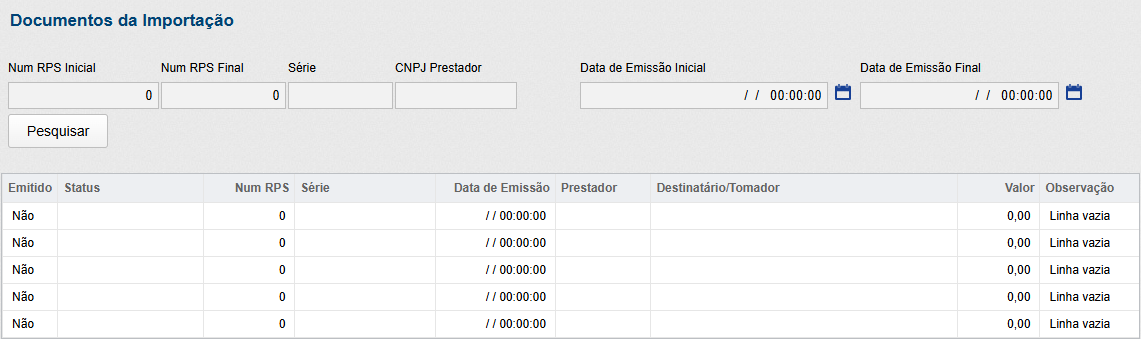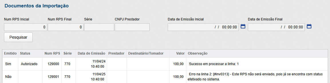 Importação de um RPS já emitido no InvoiCy: Na hipótese de importar uma planilha com um RPS já emitido no InvoiCy, será retornada a mensagem informando que o documento já encontra-se com um status definitivo no sistema. No entanto, para documentos com o status rejeitado, pendente e inutilizado o sistema permitirá reenviar.