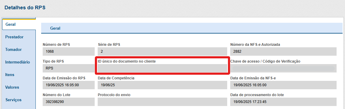 Desta forma, é possível importar a planilha .CSV sem informar os valores nas colunas "RPSNumero" e "RPSSerie", gerando automaticamente um ID único para cada documento da planilha. O ID Único do Cliente pode ser visualizado acessando os detalhes do documento na aba "Geral", conforme evidenciado abaixo: