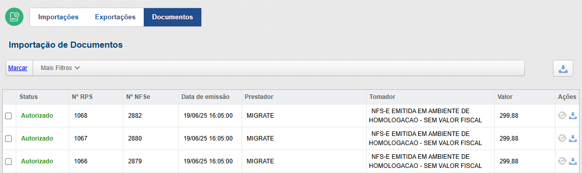 A partir dessa aba, é possível visualizar os documentos importados anteriormente por meio da extensão, com a opção de corrigi-los ou exportá-los. Para facilitar a busca, se encontram disponíveis filtros na tela, através da opção "Mais Filtros".