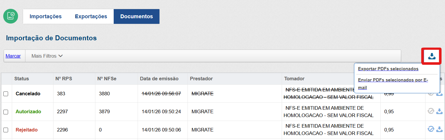 Além disso, existem duas opções para exportar PDFs: "Exportar PDFs selecionados", que permite o download do PDF dos documentos selecionados. Com essa opção, é possível realizar o download de até 1.000 documentos de uma vez. Dessa forma, para até 50 documentos, o download é síncrono e imediato.