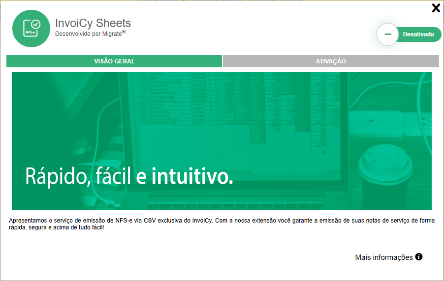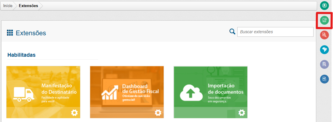 Para realizar a ativação desse serviço, abra a janela de "Extensões" no canto superior direito do InvoiCy e clique no ícone da extensão "InvoiCy Sheets".