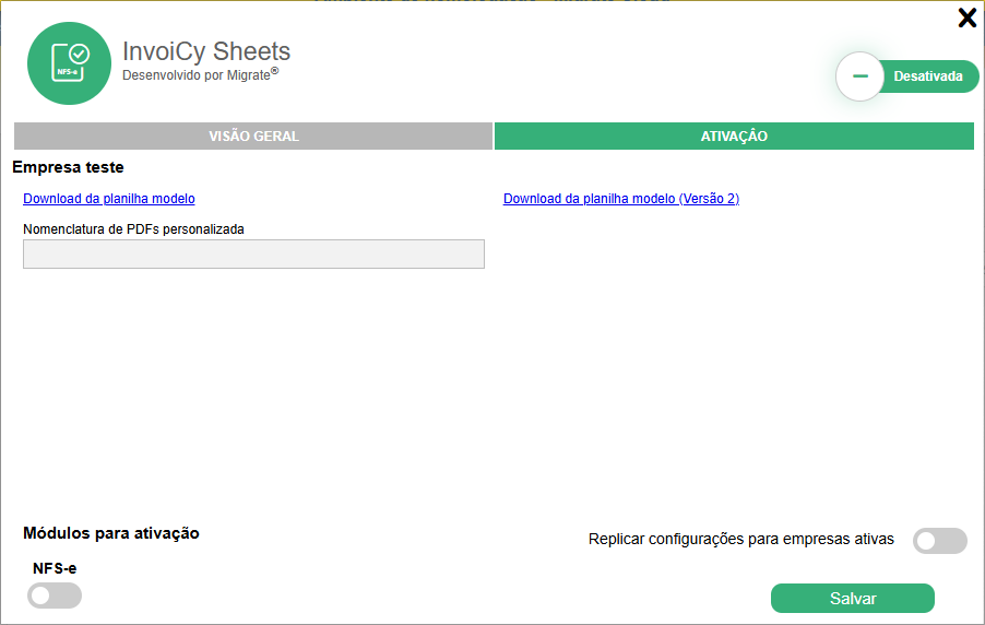 Por fim, dentro dessa mesma aba se encontra a opção de ativar a extensão. Para ativá-la, selecione a(s) empresa(s) em que se deseja ativar ou desativar esse serviço, de acordo com os seus acessos, e clique na opção "Salvar".