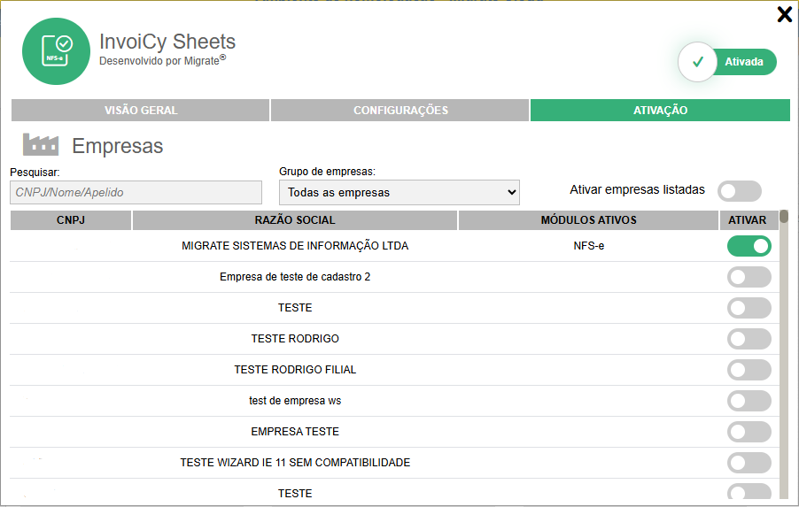 Através da nova aba de "Ativação", é possível selecionar a(s) empresa(s) em que se deseja ativar ou desativar esse serviço, de acordo com os seus acessos. Também é possível buscar por determinadas empresas mediante as opções de filtro: CNPJ/Nome/Apelido e Grupo de Empresas. Além disso, a funcionalidade oferece a opção "Ativar Empresas Listadas", que permite ativar a extensão para todas as empresas às quais o usuário tem acesso.