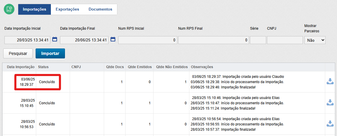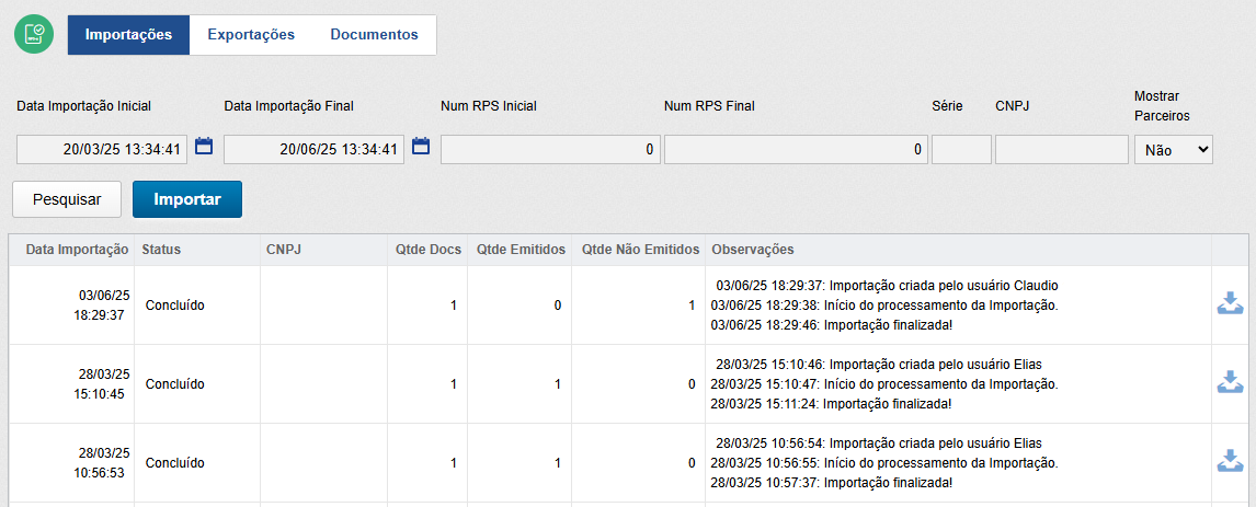 Ao acessar a extensão, a aba "Importações" será apresentada, onde serão exibidas as importações por planilhas realizadas pela empresa selecionada e/ou por empresas parceiras. Sendo possível buscar por importações específicas, por meio das opções de filtro: Data Importação Inicial/Final, Num RPS Inicial/Final, Série, CNPJ e Mostrar Parceiros.
