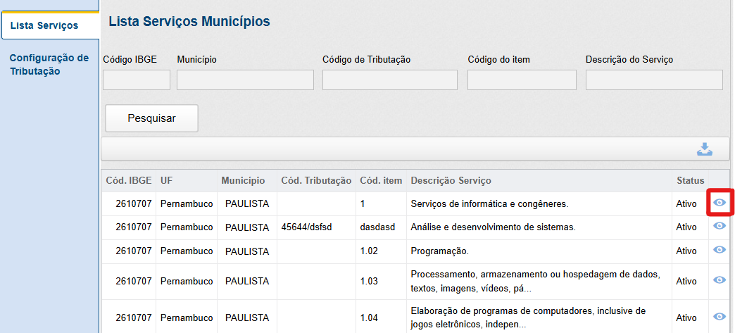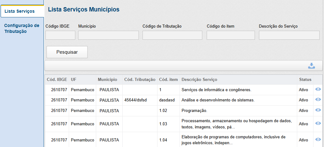 Em seguida, a tela com a lista de serviços será exibida. Nesta tela é possível localizar os serviços disponíveis em um determinado município, buscando por meio do código IBGE do mesmo, pelo nome do município, código de tributação, código do item da lista de serviços ou pela descrição do serviço.