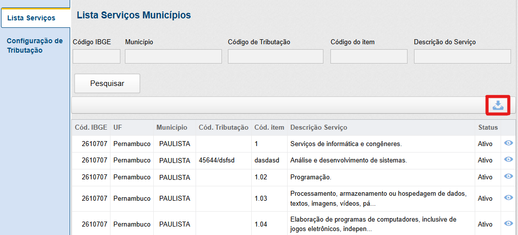 Para utilizar essa opção, informe o código do IBGE de um município que esteja habilitado, para que seja possível exportar toda a lista de serviços do município selecionado.
