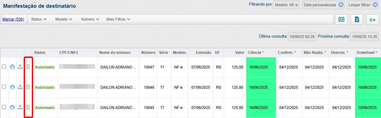 Para realizar o download do arquivo XML da NF-e completa é necessário realizar a Manifestação do Destinatário. Somente após a ciência ou confirmação da operação que será liberado o download do arquivo XML através do ícone de download da grid.