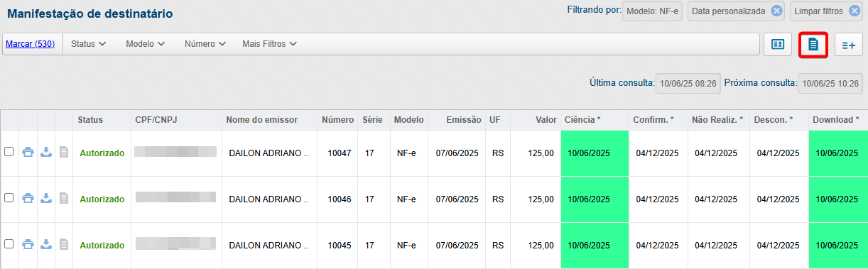 O relatório resumido trará os CNPJs, a razão social e a quantidade de documentos que foram recebidos, baixados ou importados. Já no relatório detalhado, mais informações serão exibidas, como a chave de acesso dos documentos, o valor, número e série, e o status da manifestação desses documentos. Logo após selecionar o tipo do relatório, o download do PDF será iniciado.