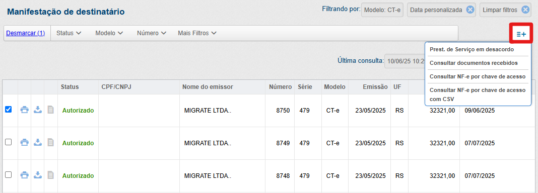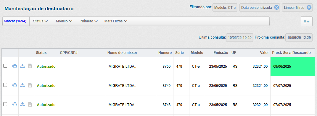 Com essa extensão, também será possível gerenciar os CT-es emitidos onde a sua empresa é o tomador, e realizar o evento de Prestação de Serviço em Desacordo sobre esses documentos.