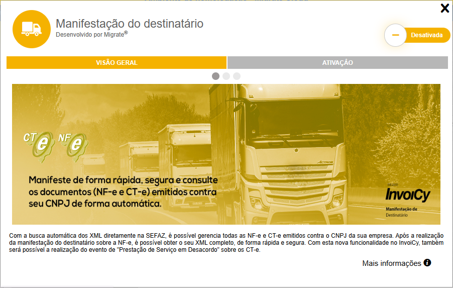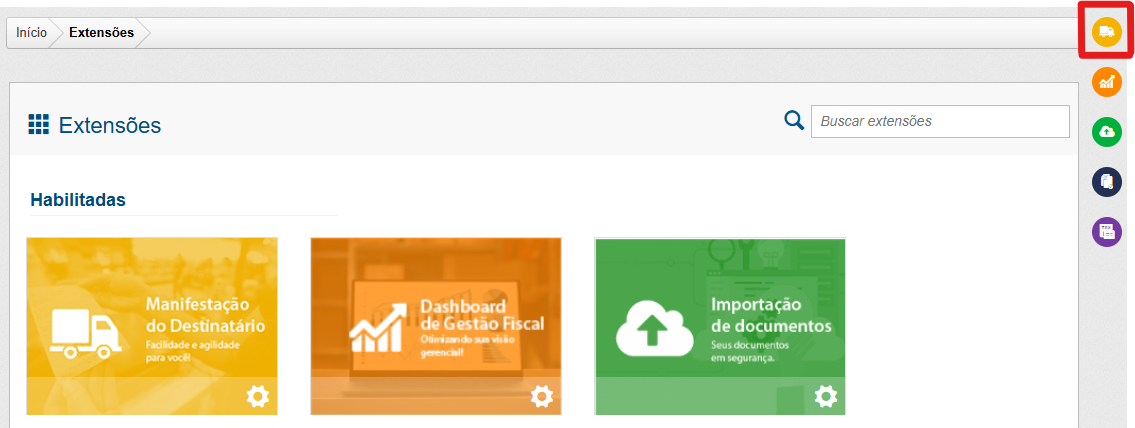 Para realizar a ativação desse serviço, abra a janela de "Extensões" no canto superior direito do InvoiCy e clique no ícone da extensão "Manifestação do Destinatário".