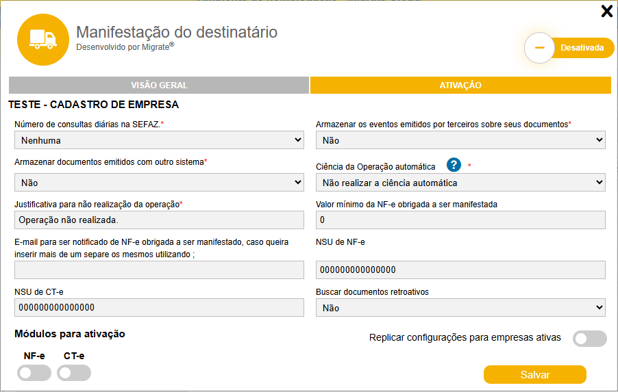 Na aba "Ativação" se encontra a opção de ativar a extensão. Para ativá-la, selecione o módulo NF-e e/ou CT-e e configure os seguintes parâmetros: