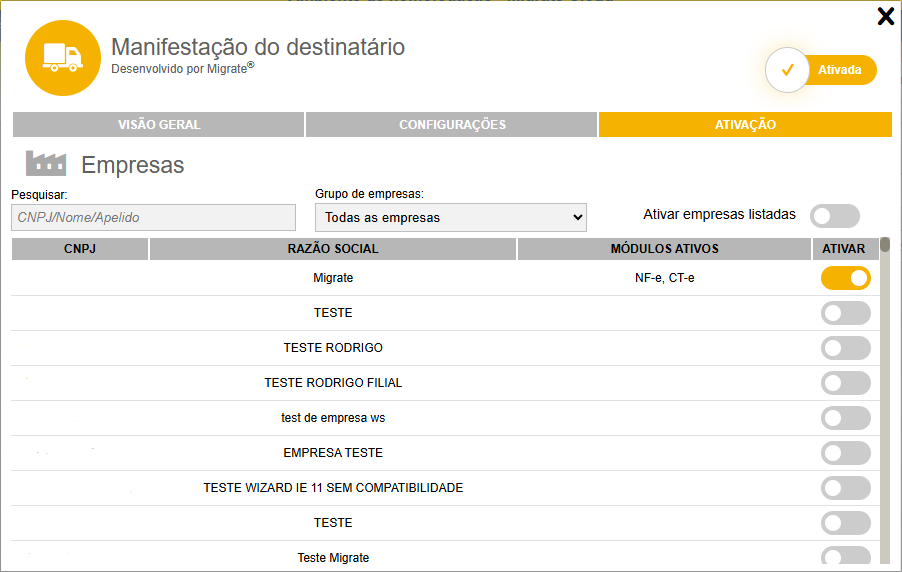 E ainda oferece a opção "Ativar Empresas Listadas", que permite ativar a extensão para todas as empresas às quais o usuário tem acesso.
