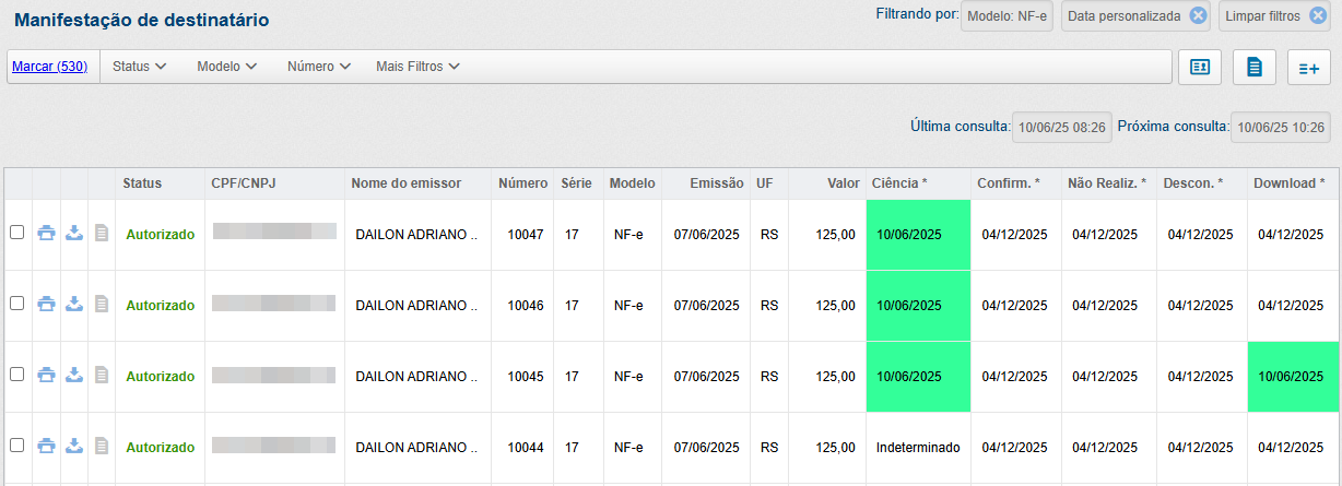 Vale destacar, que de acordo com a legislação não existe um prazo para efetuar a Ciência da Operação para a NF-e. Dessa maneira, a coluna referente a Ciência da Operação exibe a descrição "Indeterminado" para documentos em que esse evento não foi realizado. Contudo, após o envio do evento a descrição da coluna será atualizada, para a data de emissão do evento, e destacada com a cor verde, como demonstrado abaixo: