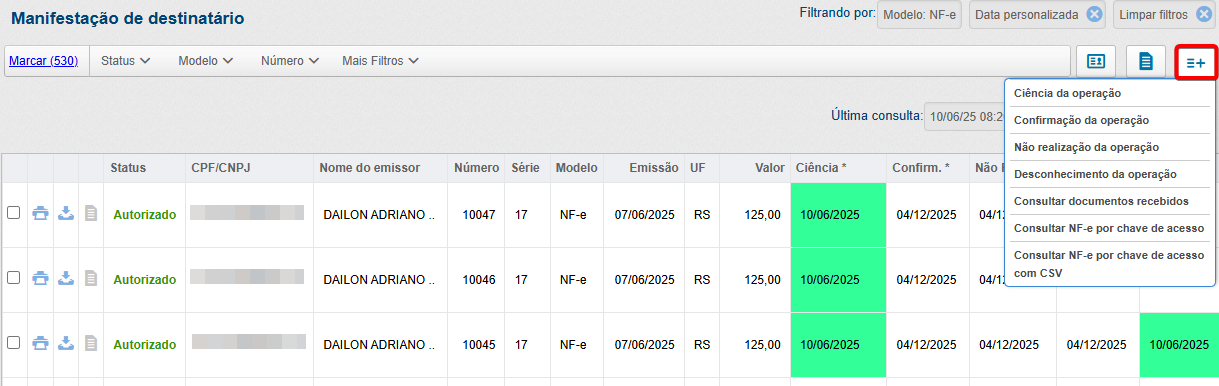 Para realizar a manifestação, selecione no checkbox da grid o documento desejado, e por meio do ícone localizado na parte superior direita da grid, escolha entre as ações disponíveis: Ciência da operação, Confirmação da operação, Não realização da Operação e Desconhecimento da Operação.