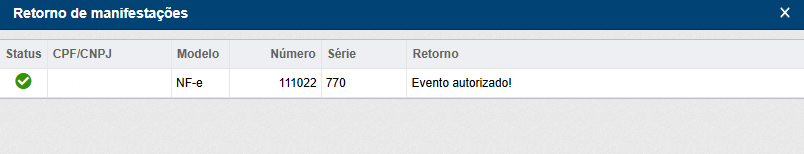 Após será apresentada uma nova tela com o retorno das manifestações, indicando se a mesma foi concluída com sucesso, ou se houve alguma falha, especificando na coluna "Retorno".