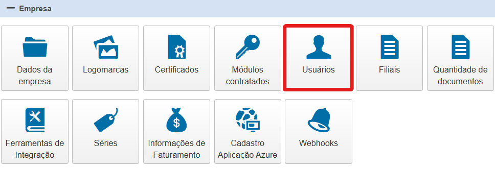 Para iniciar o cadastro de usuário da empresa, acesse o grupo Empresa na seção "Painel de Controle" e clique no ícone "Usuários", conforme demonstrado abaixo: