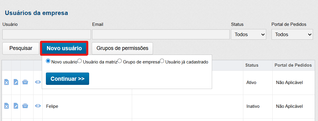 Em seguida, a tela "Usuários da Empresa" será apresentada. Nesta tela, se localizam todos os usuários previamente cadastrados, juntamente com os ícones de excluir, editar, empresas do usuário e logs do usuário.