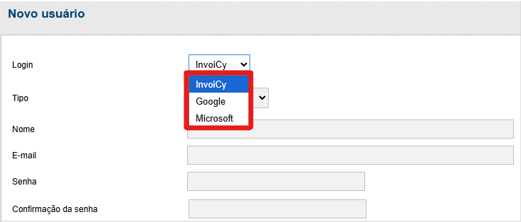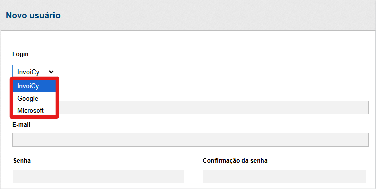 O InvoiCy fornece a opção de login único na plataforma, ou seja, através da geração de um link o usuário terá acesso ao InvoiCy sem precisar informar os seus dados de acesso cada vez que desejar logar no mesmo. Para utilizar essa funcionalidade, contamos com uma integração com a Azure presente no cadastro de usuários no campo "Login", que pode ser feito tanto pela opção de cadastro de usuários da empresa como de parceiro.