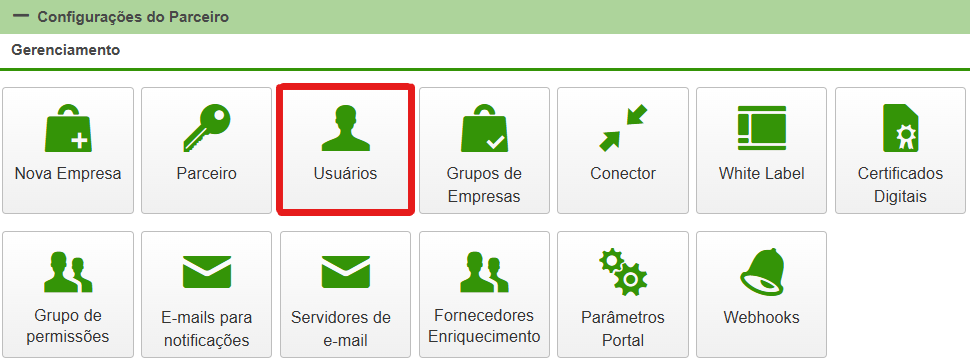Para iniciar o cadastro de usuário de parceiro, acesse o grupo Parceiro na seção "Painel de Controle" e clique no ícone "Usuários", conforme evidenciado abaixo: