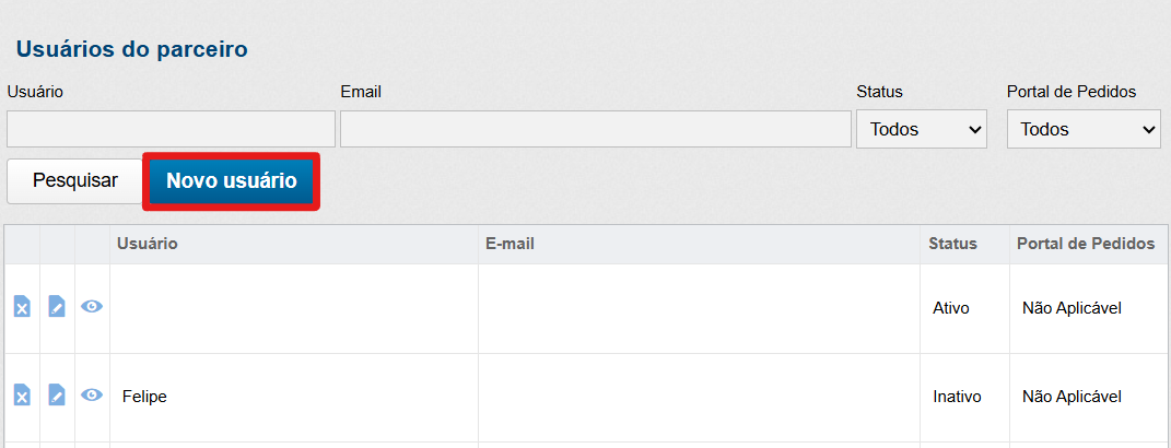 Em seguida, a tela "Usuários do Parceiro" será apresentada. Nesta tela, se localizam todos os usuários previamente cadastrados, juntamente com os ícones de excluir, editar e logs do usuário.