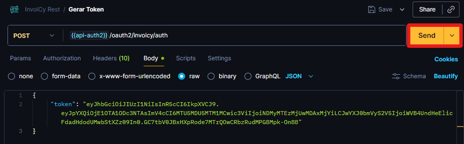 Na sequência, localize a requisição "Gerar Token", clique nela e selecione a seção Body (raw). Em "token" informe o JWT gerado e clique em "Send" para realizar o envio, conforme demonstrado abaixo: