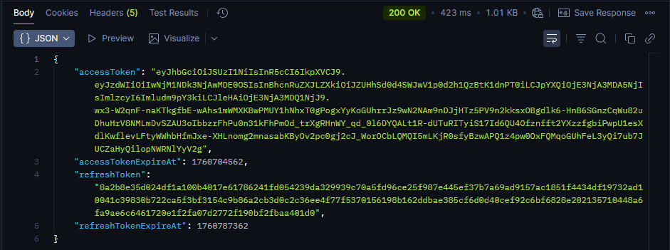 No retorno da requisição serão exibidos o accessToken e o refreshToken, que são essenciais para realizar todas as demais requisições via API REST. Segue abaixo um exemplo deste retorno: