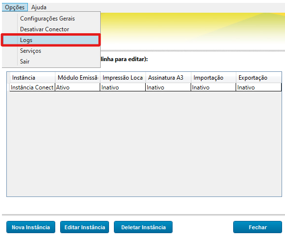 No entanto, quando ocorrer alguma falha no cadastro a mesma também estará representada no arquivo de retorno, ou ainda nos logs do Conector. Para acessar os logs basta abrir o Conector e no menu superior clicar em Opções e selecionar "Logs", como demonstrado a seguir: