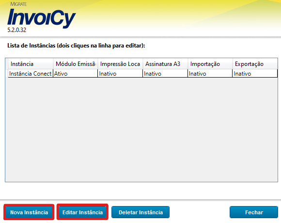 As instâncias cadastradas serão exibidas na tela inicial. Para editar uma instância existente, clique duas vezes na linha correspondente ou utilize o botão "Editar instância". No entanto, se não houver instâncias cadastradas, clique em "Nova instância" para acessar a tela de cadastro e configurações, conforme segue: