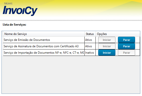 Ressaltando que, o serviço será iniciado para todas as instâncias cadastradas e ativadas ao selecionar esta opção. No entanto, as instâncias que tiverem a opção "Ativar emissão de documentos" desmarcada não terão seus documentos processados. Para interromper o serviço de emissão, basta clicar em "Parar".
