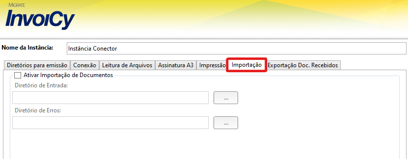 Através desta aba, é possível ativar o processo de importação, por meio da opção "Ativar Importação de Documentos", e configurar um diretório de entrada onde serão armazenados os arquivos emitidos que devem ser importados para o InvoiCy e um diretório de erros.