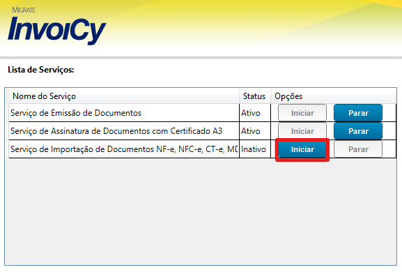 Para facilitar o gerenciamento dos documentos de importação gere uma estrutura de diretório onde a entrada e erros estejam na mesma pasta. Após, clique em "Salvar" para registrar estas configurações e inicie o "Serviço de Importação de Documentos NF-e, NFC-e, CT-e e MDF-e", localizado na opção "Serviços" na tela inicial.